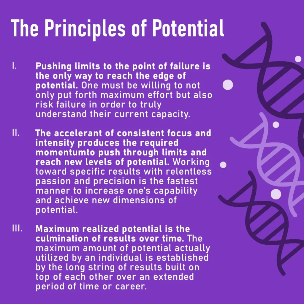 The principles of imagination and potential are strands in the DNA of athletic achievement. They determine the ultimate outcomes or consequences of emotions and behavior in sports. On your journey to master the mental game you will utilize the principles of imagination and potential. The principles will be your guide as you travel down the path of peak performance toward the edge of your potential, and learn how to push your limits to move that edge.